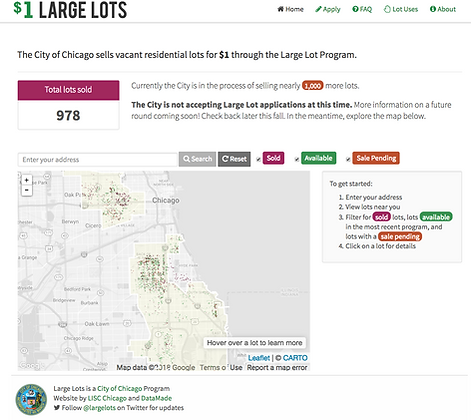By looking at the latest program by the City of Chicago, Large Lots, as a starting point, we researched other existing mechanisms for land acquisition. Large Lots program by far has the most developed and accesible public interface (a digital platform / website) to visualize the inventory of lots in three different categories: available, sale pending, and sold; and to offer some resources to property buyers to learn about potential uses for those parcels, understand regulation requirements, and capital investment costs for improvement. One of this resources is the Activation Guide.